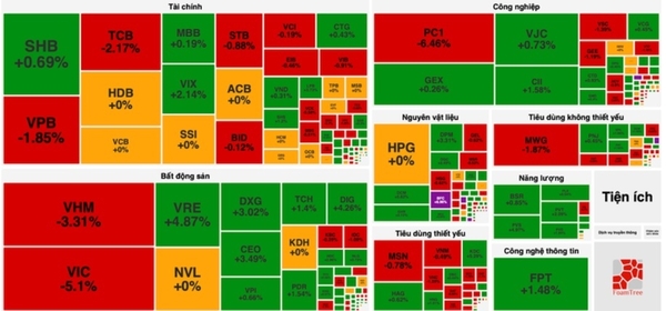 은행 대형주들이 약세를 보였는데, TCB가 2.17%, VPB가 1.85%, STB가 0.88%, BID가 0.12% 하락한 반면, MBB는 0.19%, CTG는 0.43%, SHB는 0.69% 상승했다.