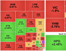 거의 하루 종일 상승세를 보이던 증시는 장 마감 30분을 앞두고 빈그룹과 빈홈즈 주식의 하락을 중심으로 40포인트 가까이 급락했다. VN 지수는 처음에는 개장가보다 낮은 수준에서 거래되었다. 그러나 지수는 빠르게 회복하여 1,790포인트 부근까지 상승했다. 고점을 경신한 VHM의 급등세에 힘입어 전체 지수는 지지를 받으며 오전 10시 이후 1,800포인트를 돌파했다. 점심시간 무렵 시장은 소폭 조정을 겪었다. 오후 초반, VN 지수가 기준선 아래로 잠시 하락하는 변동성이 나타났지만 큰 폭의 하락은 없었다. 주가는 빠르게 회복하여 1,790포인트 부근에서 등락했다. 오후 2시 30분경, 지수는 거의 수직으로 급락하여 ATC 세션 시작 전 대비 50포인트 하락했다. VN-지스는 약 1,743포인트로 마감하며 기준선보다 거의 40포인트 낮은 수준을 기록했다. 이는 약 2주 만에 가장 큰 폭의 조정이다. 호치민 증권거래소(HoSE)에 상장된 전체 종목의 약 65%에 해당하는 238개 종목이 하락했으며, 대형주부터 중소형주까지 다양한 업종이 영향을 받았다. 반면, 상승한 종목은 87개에 불과했다. VHM과 VIC는 시장에 가장 큰 영향을 준 두 종목으로, VN-지수를