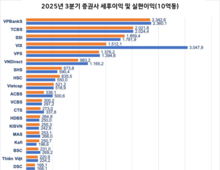 베트남 증권업계가 최근 주식시장의 반등세를 타고 2025년 3분기 사상 최대 실적을 기록했다. 통계에 따르면, 지난 분기 전체 증권업계에서 세전 이익 1000억 동을 초과한 24개사가 발표됐으며, 이 중 6개사는 1조 동 이상의 이익을 달성했다. 24개 증권사의 총 세전 이익은 17조 250억 동에 달해 작년 동기 대비 2.7배 상승한 수치다. 특히 1조 동 이상 이익을 보고한 6개사의 세전 이익 총액은 11조 7740억 동을 넘어섰다. 이는 업계의 강력한 회복 모멘텀을 보여주는 지표로, 주식 거래량 증가와 수수료 수익 확대가 주요 요인으로 꼽힌다. 실현이익 기준 랭킹 급변… '가짜 이익' 현상 주목 세전 이익뿐 아니라 증권사들의 실현이익(실제 현금화된 이익)도 사상 최고치를 경신했다. 전체 업계에서 실현이익 1000억 동을 초과한 증권사는 23개사에 달했다. 이는 시장의 실질적 활성화와 자산 관리 효율성을 반영한 결과다. 세전 이익 1000억 동 초과 업체 중 실현이익이 이 기준 미달인 곳은 두 곳뿐이다. 바오비엣 증권사(BVSC, 코드: BVS)는 실현이익 797억 동, 세전 이익 1005억 동을 기록했으며, 롱비엣 증권사(VDSC, 코드: VDS)는 실