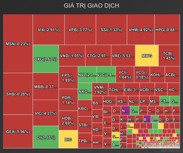 대형주 그룹 전반에 매도세가 퍼지며 시장은 붉은 불길에 휩싸였다. VN지수는 36포인트 가까이 하락했으며, VN30지수는 45포인트를 초과하는 폭으로 떨어졌다. 일부 중소형주는 상승세를 유지하려 했으나 전체 추세를 뒤집기에는 역부족이었다.