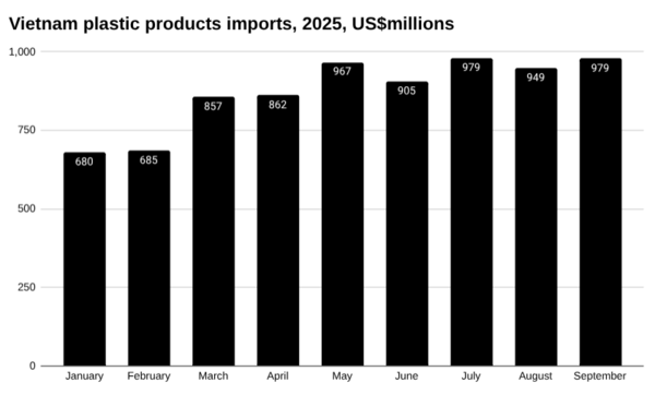 베트남 세관총국의 예비 자료에 따르면, 2025년 9월 베트남의 플라스틱 제품 수입액은 9억 7,907만 달러로 전월 대비 3.14% 증가했다. 연초부터 현재까지 수입액은 78억 7,000만 달러에 달했다.