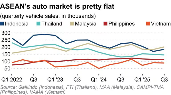 닛케이 아시아에 따르면, 2025년 3분기 말레이시아의 자동차 판매량은 2년 연속 인도네시아를 앞지르며 동남아시아 자동차 시장에 중요한 변화를 가져왔다. 닛케이가 인도네시아, 말레이시아, 태국, 필리핀, 베트남 등 동남아시아 5대 시장에서 집계한 데이터에 따르면, 7월부터 9월까지 총 판매량은 731,963대로, 2024년 동기 대비 4% 감소했지만 전분기 대비 4% 증가했다. 2024년 초 이후 2024년 4분기에만 80만 대를 넘어섰는데, 이는 수요가 둔화되고 있음을 보여준다.