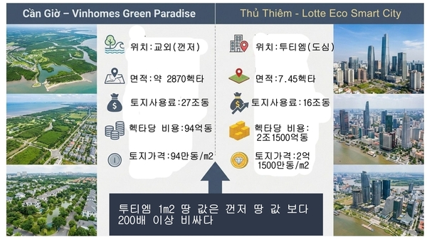 2,900헥타르 규모의 빈홈스 깐지오는 이미 토지 매입을 완료하고 대규모 개발이 진행 중인 반면, 8헥타르도 채 되지 않는 투티엠 에코 스마트 시티는 평방미터당 토지 가격이 2억 동을 넘어서면서도 개발이 정체된 상태이다.