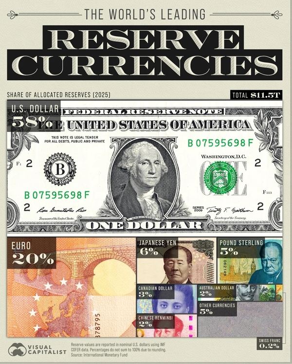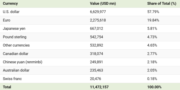 미국 달러는 여전히 글로벌 준비금 시스템의 중추로 남아 있으며, 중앙은행은 약 6조 6,000억 달러의 달러 표시 준비금을 보유하고 있다. 이는 보고된 전체 글로벌 준비금의 거의 58%에 해당한다.