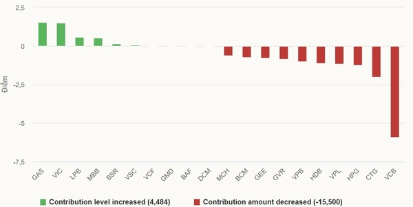 비엣틴뱅크(Vietinbank)의 CTG도 뒤이어 하락하며 전체 지수 하락에 2포인트 이상을 기여했다. 이 주식은 기준 가격보다 3.1% 하락한 37,400 동/주를 기록했다. HPG, VPL, HDB, VPB 등도 시장의 하락에 영향을 미쳤다. 반면, VN-지수는 GAS와 VIC의 강세에 힘입어 상승세를 보였다.