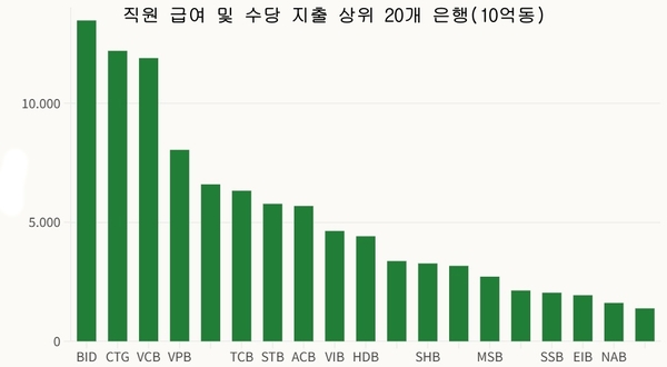 27개 은행 중 절반 가까이가 전년 대비 직원 보상비용을 10% 이상 늘렸다. VP뱅크는 사상 최대 이익(3조 6,000억 동 이상)과 인력 2,500명 확충 속 상여금 예산이 1.5배 폭증했다. NCB도 40% 가까이 증가(1,000억 동 이상)했다.