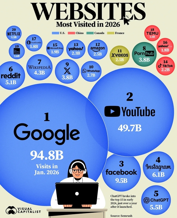 [굿모닝베트남미디어] 구글은 월간 방문 횟수 약 950억 건으로 2026년에도 세계에서 가장 많이 방문하는 웹사이트 자리를 유지할 것이다. 유튜브는 2위를 차지하며 알파벳의 글로벌 인터넷 트래픽 지배력을 다시 한번 입증했다. 챗GPT는 레딧, 위키피디아, X를 제치고 세계 5위권에 진입했다.
