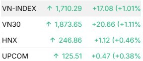 빈그룹의 지원: VIC(+1%), VHM(+2%) 등 빈그룹 관련주들도 긍정적인 흐름을 보이며 VN지수가 1,710포인트(+17pt)로 3일 연속 하락세를 끊고 반등하는 데 결정적인 역할을 했다.
