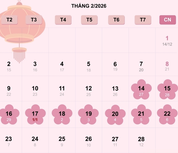 제안에 따르면, 신년을 맞아 공무원과 근로자는 규정대로 5일(설 전 1일, 후 4일) 휴가를 가지며, 전후 주말 2일을 더해 총 9일로 된다. 음력 12월 27일부터 1월 6일까지다. 공무원과 근로자는 뗏 7일인 2월 23일에 복귀한다.