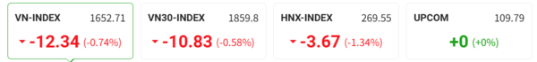 오늘 VHM이 VN지수에 가장 부정적 영향을 미쳤으며, 2.6% 하락해 9만8600동을 기록했다. VPB가 2.4% 조정으로 뒤를 이었으며 유동성은 전체 시장 3위인 9700억 동을 초과했다. 반면 VIC은 일반 지수가 너무 깊이 떨어지지 않도록 지탱했다. 빈그룹 주식은 0.6% 상승한 17만1000동을 기록했다.