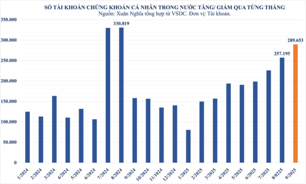 9월 국내 개인 증권 계좌 수가 28만 9천 개 이상 증가하며 12개월 만에 최고치를 기록했다. 유동성 감소와 FTSE 러셀 지수 상향 조정 결과를 기다리는 시장 분위기 속에서 이러한 신규 계좌 개설이 이루어졌다. 베트남 증권예탁결제원(VSDC) 자료에 따르면, 9월 국내 주식시장에서 개인 계좌 28만 9,653개가 추가되어 지난 한 해 동안 가장 높은 수준을 기록했으며, 총 계좌 수는 1,098만 개로 전체 인구의 약 10%에 해당한다.