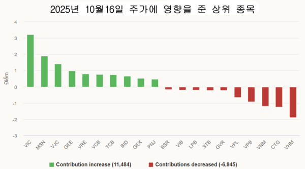 VIC는 주당 213,100동(VND)으로 1.7% 상승하며 종합 지수에 가장 큰 기여를 했다. 유동성 또한 1조 980억 동(VND)을 돌파하며 높은 수준을 기록했다. 또한 VN 지수는 VJC, GEE, VRE 등의 영향을 받았다.