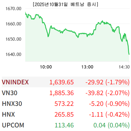 VN 지수는 장 마감 후 회복세를 보이며 약 30포인트 하락한 1,640포인트로 마감했다. 이는 약 2주 만에 최저치이다.
