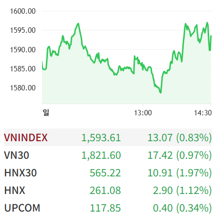베트남 호치민 증시가 최근 급락 여파를 딛고 강한 반등세를 보였다. VN지수는 이날 1,593포인트로 마감하며 전일 대비 13포인트(0.8%) 상승, 3거래일 연속 하락을 끊었다.