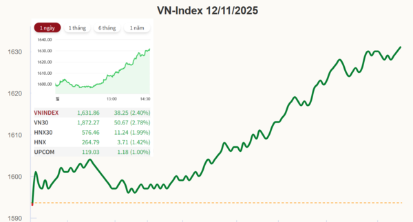호찌민 VN 지수는 장 내내 상승세를 보이며 상승폭을 확대했다. 막판 강력한 자금 유입으로 VN 지수는 38포인트 급등하여 1,632포인트에 장을 마감했다. 이는 지난 한 달 동안 가장 큰 폭의 상승폭이다.