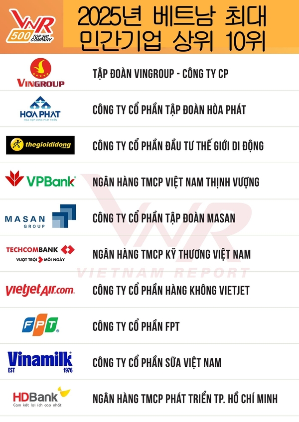 10대 민간기업 순위에서 빈그룹(Vingroup)이 선두 자리를 지켰다. 호아팟(Hoa Phat), 모바일월드(Mobile World), VP뱅크(VPBank), 마산그룹(Masan Group)은 2024년과 비교해 이 네 곳의 순위를 유지했다.
