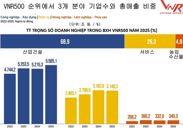 2022년 4,744조 동에서 2025년 5,565조 동으로 총 매출이 증가하면서, 산업-건설 부문은 2025년 VNR500 순위에서 대기업 구조에서 선두 자리를 계속 유지하며 순위에 오른 전체 기업 수의 68%를 차지하며 경제 성장의 주요 원동력 역할을 하고 있다.