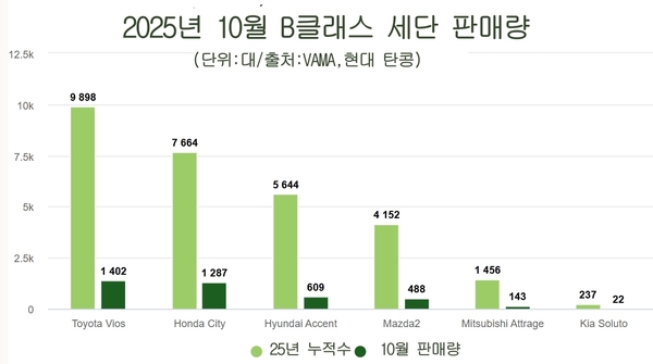 베트남 B급 세단 시장은 10월 총 판매량이 3,951대를 기록하며 9월(2,778대)에 비해 42% 이상 증가하는 폭발적인 성장세를 기록했다. 이는 2025년 이 부문의 큰 판매량이다. 도요타 비오스는 상위권을 유지했을 뿐만 아니라 2025년 초 이후 가장 높은 판매량을 기록했다.