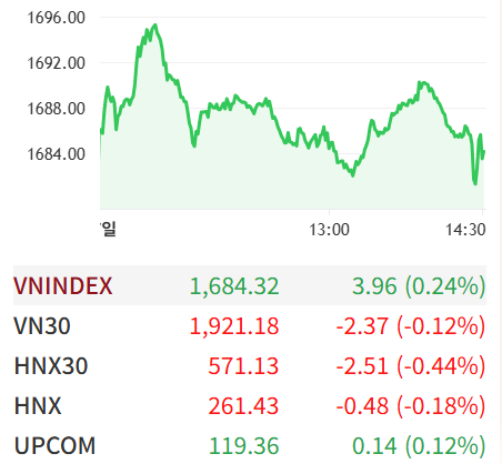 호치민거래소(HOSE)는 장 초반 15포인트 상승하며 1695포인트를 돌파했으나, 저항선 부담에 1685포인트 박스권 횡보로 전환됐다. 오후 들어 재차 조정 국면에 접어들며 상승 폭이 좁혀졌다.