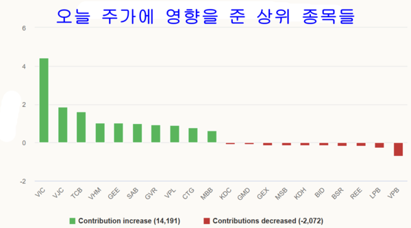 빈그룹(VNgroup) 주식 외에도 VJC, TCB, VHM, GEE 등 다른 우량주들도 시장을 적극적으로 지지했다. VN30 바스켓 전체에서 대표 지수는 약 17포인트 상승했으며, 20개 종목이 상승 마감했다.
