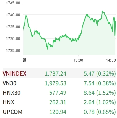 VN 지수는 은행 및 증권주로의 강력한 자금 유입에 힘입어 7거래일 연속 상승세를 이어가며 1,737포인트를 기록했다.