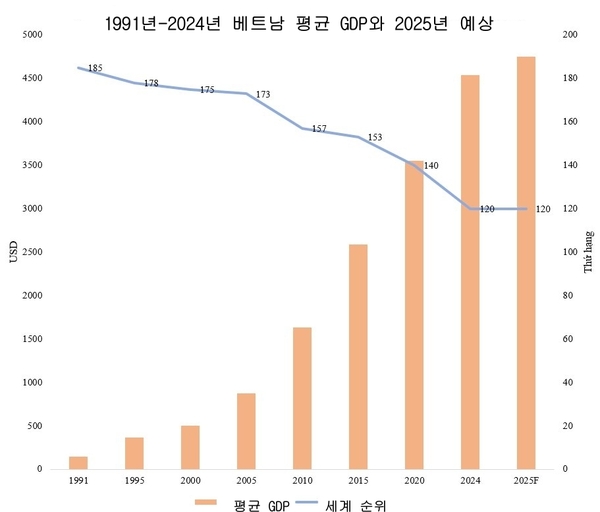 IMF의 최신 전망에 따르면, 베트남의 2025년 평균 GDP는 약 4,744달러에 달하여 세계 120위를 기록할 것으로 예상됩된다.
