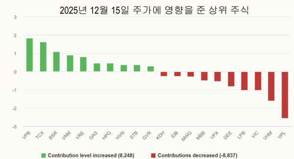 업종별로는 부동산주가 가장 부진한 흐름을 보였다. 빈그룹 외에도 KDH, NLG, NVL 등 주요 부동산 기업들이 모두 하락 마감했다. QCG와 VRE는 각각 6.8%와 5.3% 상승하며 드물게 상승세를 보였고, 지수의 추가 하락을 막는 데 기여했다.