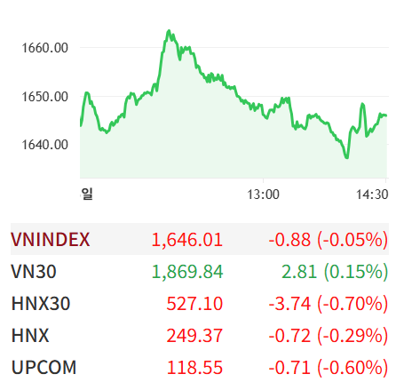 오후부터 중소형주에 대한 매도세가 다시 나타나면서 VN지수는 하락세로 전환하여 한때 11포인트까지 하락했다. 지수는 기준선 대비 1포인트 미만 하락한 1,646포인트로 마감했다.