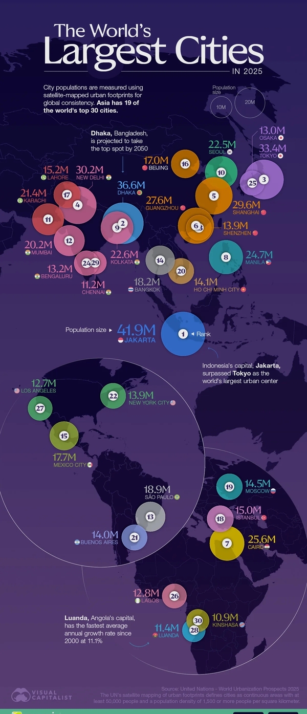 아시아는 여전히 전 세계 도시 인구의 중심지이다. 인도네시아의 수도 자카르타는 2025년 인구가 약 4,200만 명으로 세계 최대 도시로 선정되었으며, 다카, 방글라데시, 도쿄가 그 뒤를 이었다.