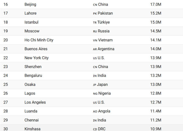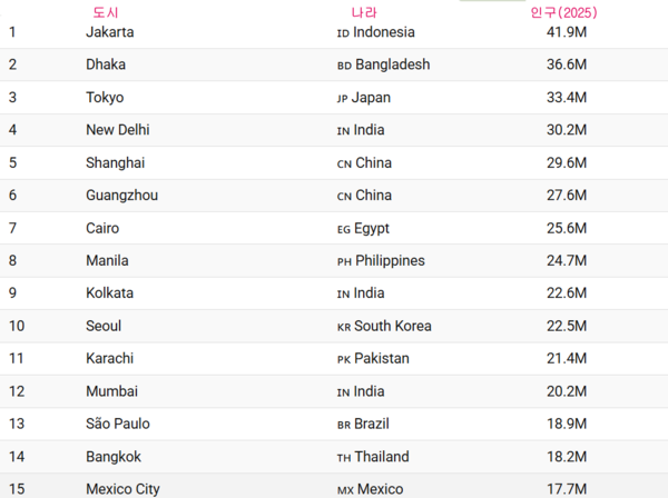 아시아의 대도시들이 순위에서 우위를 점하고 있으며, 자카르타, 다카, 도쿄가 세계 인구에서 선두를 달리고 있다. 급속한 도시 성장은 아프리카와 남아시아에 점점 더 집중되고 있으며, 일부 성숙한 도시들은 둔화되거나 축소되고 있다.