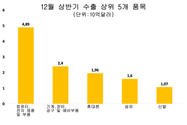 12월 상반기 상품 무역수지는 19억 6천만 달러의 적자를 기록했다. 연초부터 12월 15일까지 상품 무역수지는 186억 4천만 달러의 흑자를 유지했다.