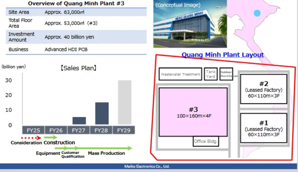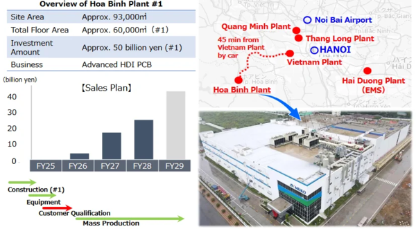 해당 공장은 6.3헥타르 부지에 총 건축면적 53,000m² 규모로 건설될 예정이며, 총 투자액은 400억 엔이다. 이 공장에서는 첨단 HDI(고밀도 광섬유) PCB를 생산할 예정이다. 위 문서에 따르면, 이 새로운 생산 시설은 더욱 가볍고 얇고 소형화되는 AI 기기 트렌드와 베트남 내 HDI 수요 증가에 부응할 것이다.