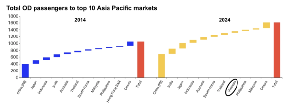 시장 성장 동력도 강력하다. 베트남 민간항공청에 따르면 2025년 여객은 8350만명(10% 증가), 국제선 4460만명(22%↑)으로 국제선이 국내선을 추월했다. 올해 관광객 목표 2400만명(2025년 대비 400만명↑)이다. ATA 아태 부사장 셸던 히는 “베트남은 지난 10년 지역 10대 성장 시장”이라며, 직항 30개국(태국·싱가포르 50개국 대비)에도 성장 여지가 크다고 평가했다.