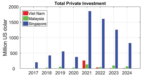 또 다른 중요한 지표는 민간 투자다. 위의 그림 2에서 볼 수 있듯이, AI(및 전반적인 기술 개발) 투자는 베트남의 주요 약점이다. 민간 AI 투자액이 2억 5천만 달러를 넘어선 것은 2021년이 유일하며(아마도 외국 기업들이 반도체 칩 생산 시설을 이전하면서 발생한 투자 덕분일 것이다), 다른 해에는 수백만 달러에 불과했다.