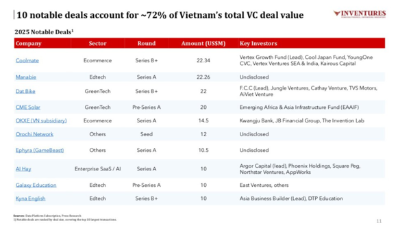 한편, 2025년 가장 큰 규모의 투자 유치는 쿨메이트(Coolmate)가 시리즈 B+ 라운드에서 2,234만 달러를 확보하면서 이루어졌으며, 마나비(Manabie)가 시리즈 A에서 2,226만 달러, 닷바이크(Dat Bike)가 시리즈 B+에서 2,200만 달러, CME 솔라(CME Solar)가 프리 시리즈에서 2,000만 달러를 유치하며 그 뒤를 이었다.