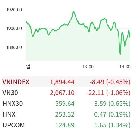 유동성은 개선되고 있지만, 호치민시 증시를 대표하는 VN 지수는 주 초반 급등세 이후 둔화 조짐을 보이고 있다. VN 지수는 오늘 기준점을 중심으로 강한 등락을 반복하며 네 차례나 상승과 하락을 오갔다. 한때 1,918포인트까지 사상 최고치를 경신했지만, 장 마감 시점에는 8포인트 이상 하락한 1,894포인트로 마감했다.