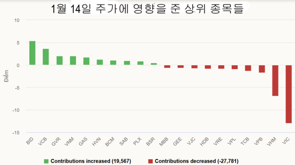 빈그룹(Vingroup) 관련 주식에 대한 매도 압력이 지수가 기준선 아래로 마감한 주요 원인이었다. VIC, VHM, VPL, VRE 등 4개 종목이 2.5~5.7% 하락하면서 지수는 총 22포인트 하락했다. 이는 빈그룹의 영향을 제외하면 지수가 상승세를 유지했을 것임을 의미한다.