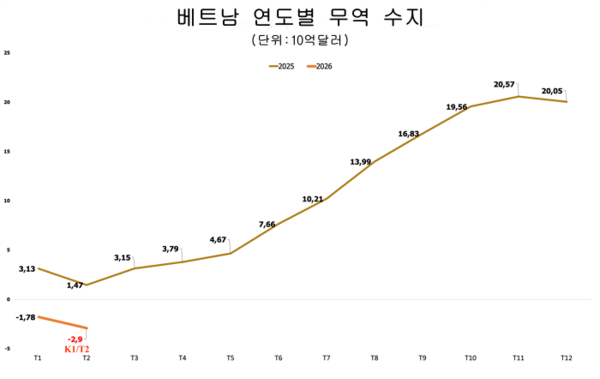 2월 15일 기준 베트남의 수출입 총액이 예상보다 큰 폭으로 증가하며 전년 동기 대비 약 37.4% 늘어난 1,301억8천만 달러를 기록했다. 다만 수입 증가율이 수출을 상회하면서 누적 약 29억 달러의 무역적자가 발생했다.