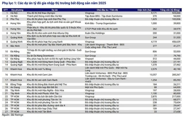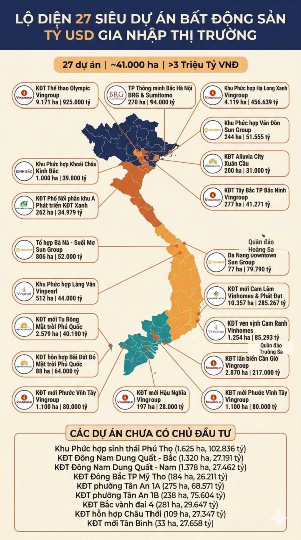 [굿모닝베트남미디어] S&I Ratings의 보고서에 따르면, 총 투자액 3조 동이 넘는 4만 1천 헥타르 규모의 27개 메가 프로젝트가 착공을 앞두고 있으며, 이는 새로운 가격 상승 사이클을 촉발하기보다는 공급을 위성 도시로 이동시키는 효과를 가져올 것이다.