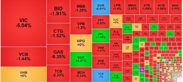 HOSE 전체적으로 하락 종목 약 240개 vs 상승 종목 3배 수준으로 적색 장세가 압도적이었다. VN30 대형주 바스켓도 23개 하락 vs 3개 상승으로 극심한 불균형을 보였다.