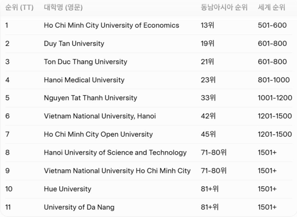 이번 순위에서 베트남은 상위 50위권에 총 7개 대학을 올려놓는 등 동남아시아 내 입지를 크게 강화했다. 이는 베트남 정부와 대학들이 연구 투자 확대, 국제 협력 강화 등에 집중한 정책의 가시적 성과로 평가된다.