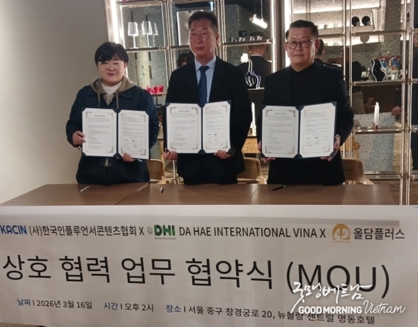 [굿모닝베트남미디어] 베트남 DHI(다해인터내셔널)그룹과 (사)한국인플루언서콘텐츠협회, ㈜올담플러스가 한·베 문화와 산업 교류 확대를 위한 전략적 협력에 나섰다.