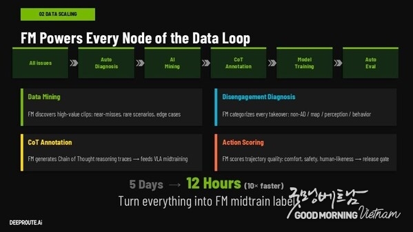 GTC 2026 발표를 통해 딥루트닷에이아이는 400억 VLA 파운데이션 모델 아키텍처가 지속적인 데이터 기반 학습과 신속한 반복 주기를 통해 확장 가능하고 안전한 자율주행으로 나아가는 경로를 어떻게 가속화하는지 시연했다.