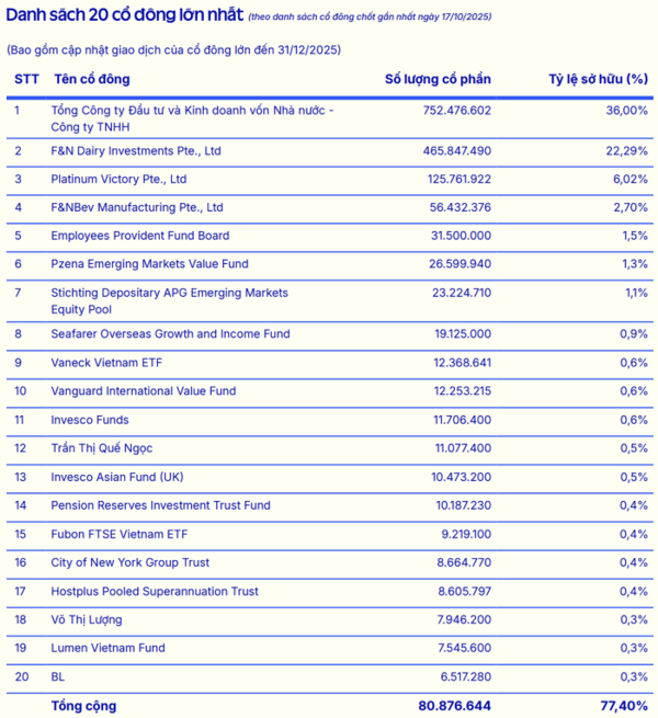 구조를 자세히 들여다보면 기관 투자자는 총 441개로, 국내 200개와 외국 241개가 전체 지분의 대부분을 쥐고 있다. 최대 주주는 베트남 국가자본투자공사(SCIC)로 36%를 보유하고 있으며, 그 뒤를 싱가포르의 F&N 다이어리 인베스트먼츠(F&N Dairy Investments Pte., Ltd.)가 22.29%, 계열사 F&N비브 매뉴팩처링(F&NBev Manufacturing Pte., Ltd.)이 2.7%이다. 또한 플래티넘 빅토리(Platinum Victory Pte., Ltd.)가 6.02%를 갖고 있다.