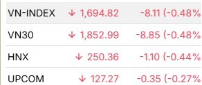 장 초반 소폭 상승하던 VN-지수는 곧바로 1,700포인트 심리적 지지선을 뚫고 급락했다. 오전에는 1,690포인트 부근에서 등락을 반복하다가 오후 들어 1,680포인트 근처까지 떨어졌으나 빠르게 회복했다. 결국 VN-지수는 전일 대비 8포인트 이상 하락한 1,695포인트 부근에서 장을 마감했다.