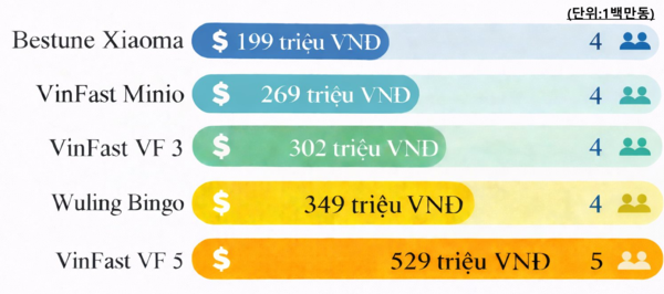 현재 베트남 시장에서 가장 저렴한 전기차 브랜드는 베스튠(Bestune), 우링(Wuling), 빈패스트(VinFast)이다. 이러한 경쟁은 단순히 가격 경쟁뿐 아니라 충전소 인프라와 도심 지역에서의 실용성에도 달려 있다.