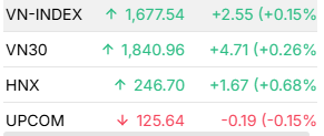 국내 투자자 자금이 일부 유입되며 VN-지수는 2포인트 이상 상승한 1,677포인트로 마감, 3거래일 연속 하락세를 마감했다.