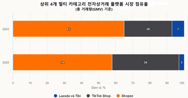 싱가포르 벤처캐피털 모멘텀웍스(Momentum Works)가 최근 발표한 ‘2025 동남아 이커머스 시장 보고서’에 따르면, 지난해 베트남에서 쇼피는 118억 달러 이상의 총거래액(GMV)을 기록하며 58%의 시장 점유율로 1위를 유지했다.